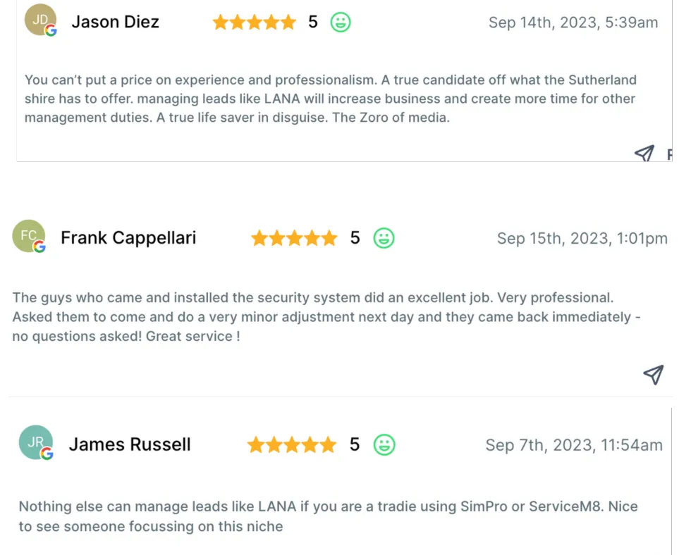 When you close off a job, LANA will get to work, getting you paid quicker, sending customer surveys and Google review requests, follow up messaging via Email and SMS and coupons to get you more work.
